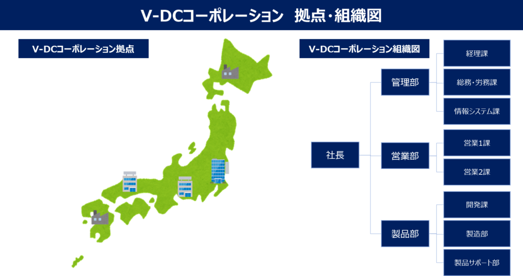 V-DCコーポレーションは、日本国内で特定業種向け製品の開発、製造、販売、サポートを一貫して行っている。本社は東京で、工場、支社として国内に4か所の支店を展開し、従業員数は100名で、本社に40名前後、各営業拠点には15名前後のスタッフがいる。