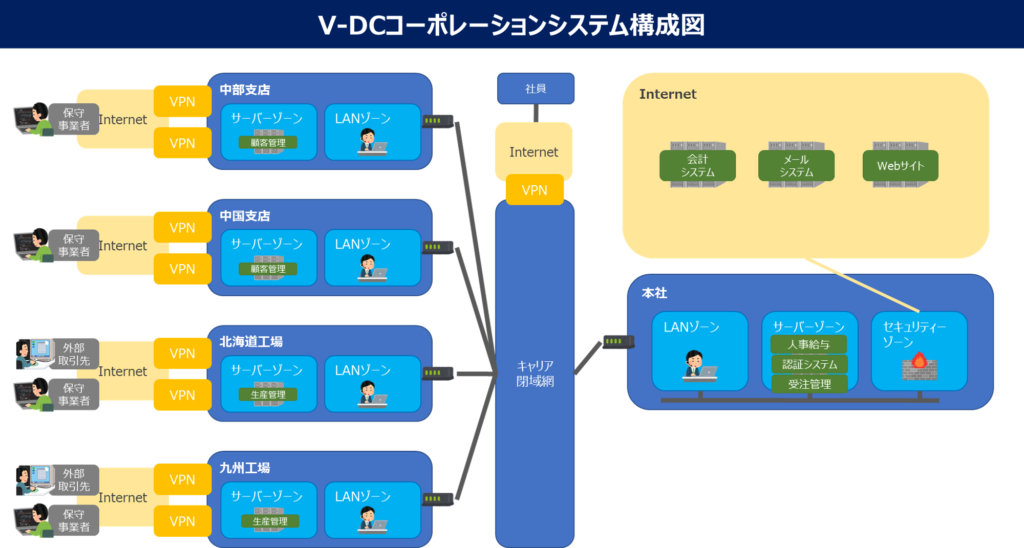 本社を中心に閉域網で接続され、インターネットを含む外部アクセスは、本社を経由しておこなれる。本社には、サーバールームが存在し、主要なマシーンはサーバールームに設置されているが、独自システムなどは支店に配置されている場合もある。